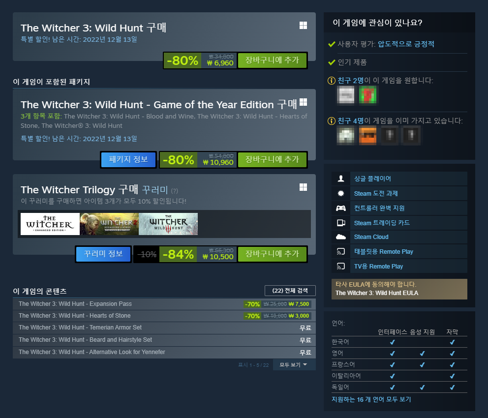 지금 스팀에서 위처3가 할인하고 있습니다.